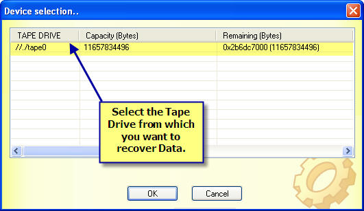 - Then select the tape drive that contain your deleted or corrupted data as in the above and click OK button, then Kernel Tape Recovery will display the following screen: